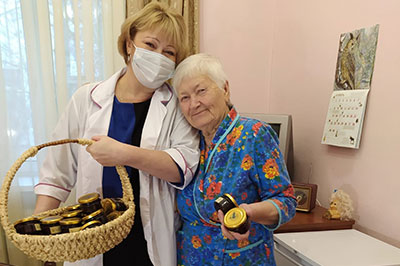 Неумолимая статистика гласит: большинство пенсионеров – люди одинокие или одиноко проживающие. Не оставлять пожилых и беспомощных людей без внимания – одна из главнейших задач не только социальных служб, но и всего общества. Большинство пенсионеров нуждаются в общении, проявлении заботы и доброты. Проводя совместно с Управлением социальной защиты акцию «Будьте здоровы» мы поздравляем пенсионеров с Днем пожилого человека и вручаем небольшие, но полезные подарки - баночки с медом или вареньем, предоставленные постоянным спонсором Greeonica.