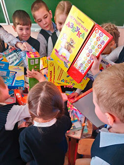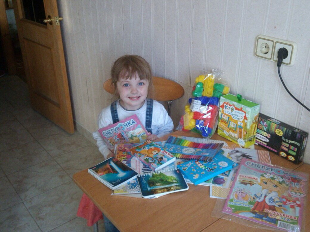 Альбомы, краски, карандаши, фломастеры, цветная бумага и картон, ножницы, ластики и ещё множество детских радостей. Особенно приятно детишкам получать открытки-послания, где написаны добрые слова.